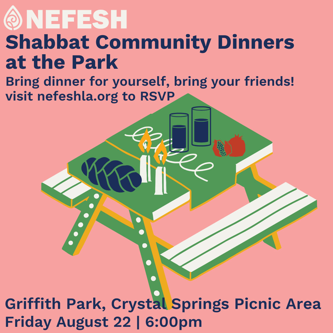 Join Nefesh in Griffith Park for a Shabbat picnic Date: Friday, August 22, 2025 Location: Crystal Springs Picnic Area (Pad B)*** 4659 Crystal Springs Dr, Los Angeles, CA 90027 Time: 6:00 pm - Sunset Nefesh will Provide: Drinking water and picnic blankets. What to bring: Friends and Family! Something to eat and drink! Ground cover, […]