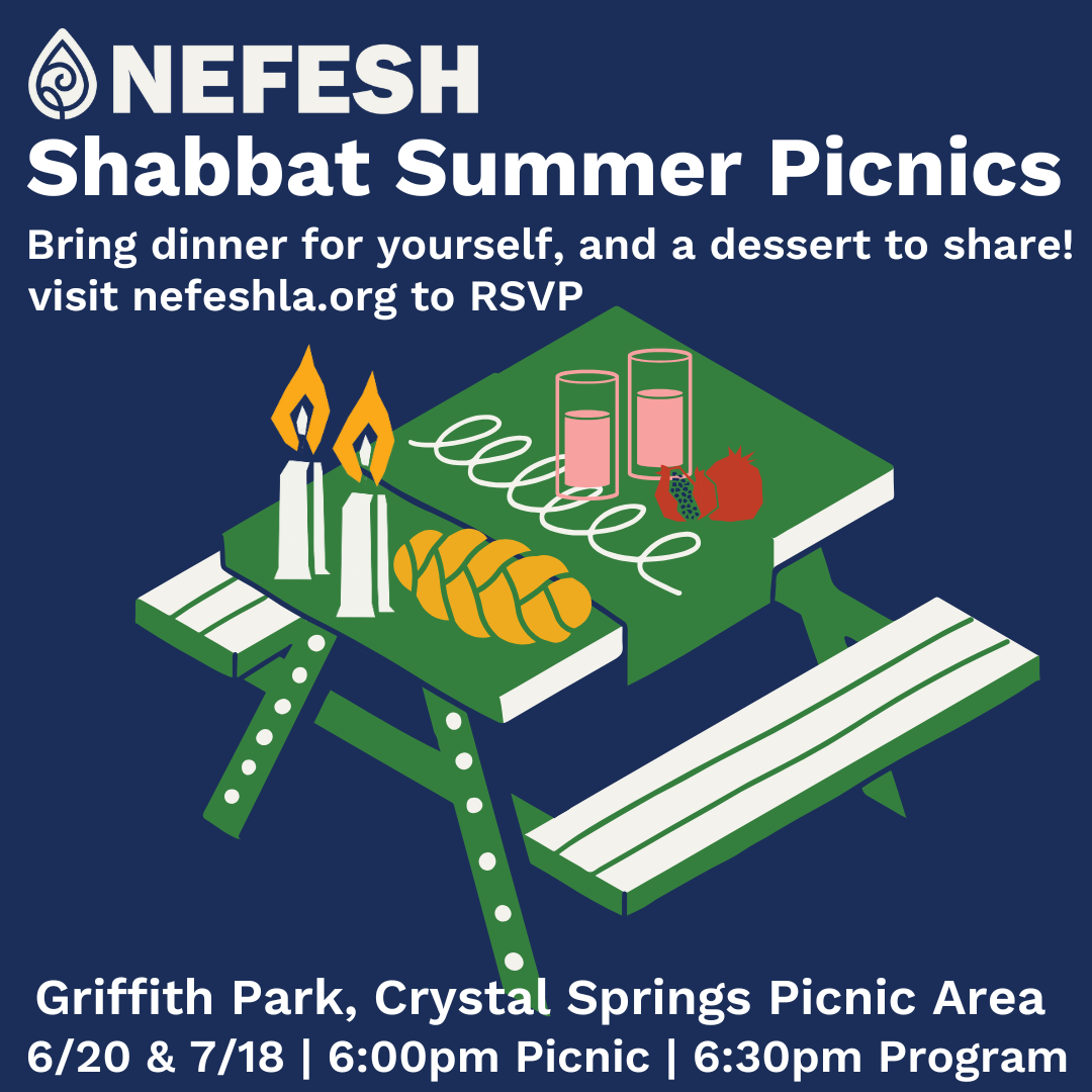 Join Nefesh in Griffith Park for a Shabbat picnic and service. Friday, July 18thCrystal Springs Picnic Area (Pad B)***6:00pm Community Picnic6:30 Songs, Study, and time to connect7:30pm Shabbat blessings We'll gather to eat and hang out at 6:00 with songs and study starting at 6:30. Stick around for more blanket hopping, star gazing, or a […]
