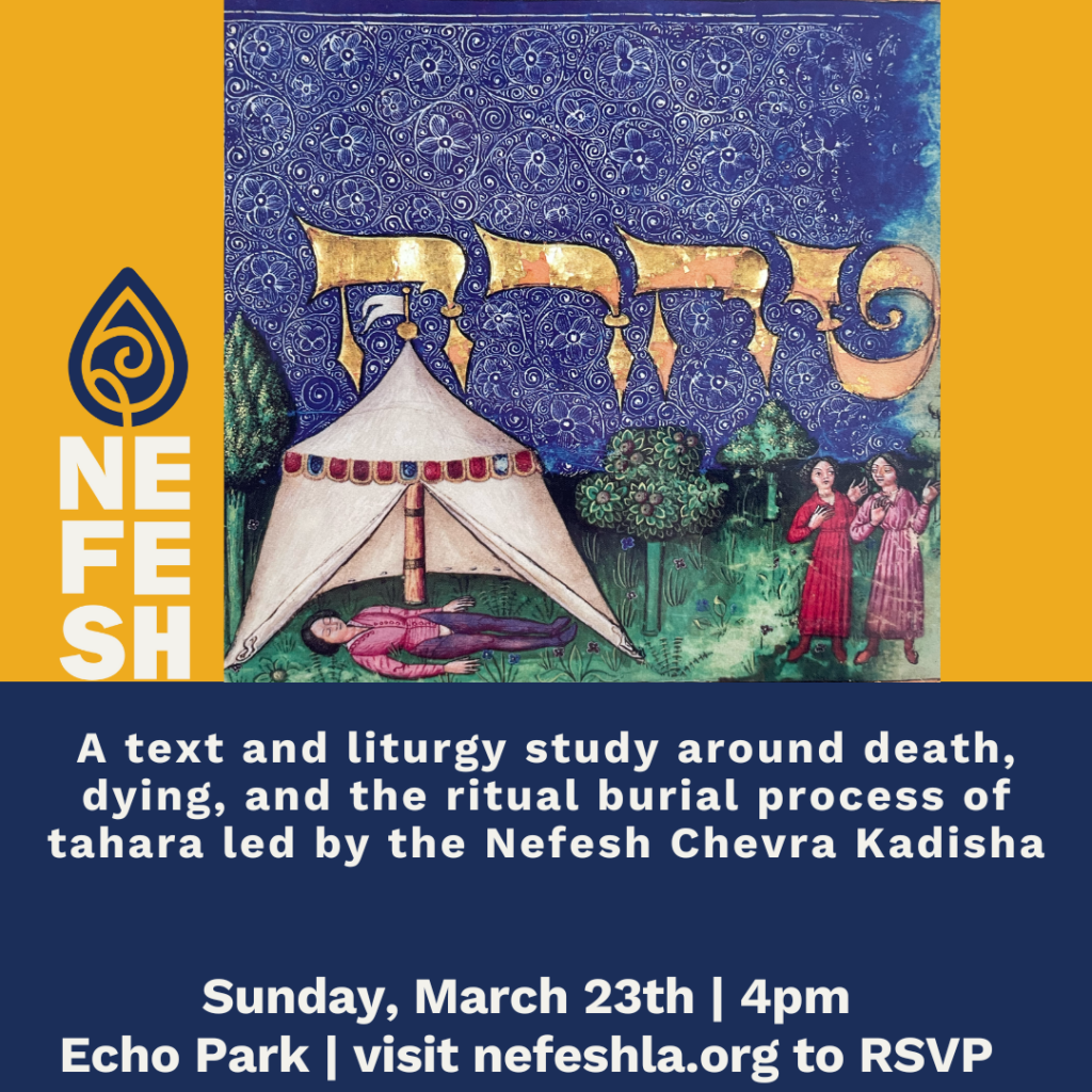 With the launch of our new Nefesh Chevra Kadisha, we invite you to join a Chevra Kadisha Text Study Session led by Sasha Perry and Nefesh Kin Julie Weinstein, on Sunday, March 23 at 4pm at The Commons in Echo Park. Together we will dive into text and liturgy study around death, dying, and the process of Tahara. Anyone can participate, even if you haven’t joined the Nefesh Chevra Kadisha. Please RSVP to Sasha at sasha@nefeshla.org.