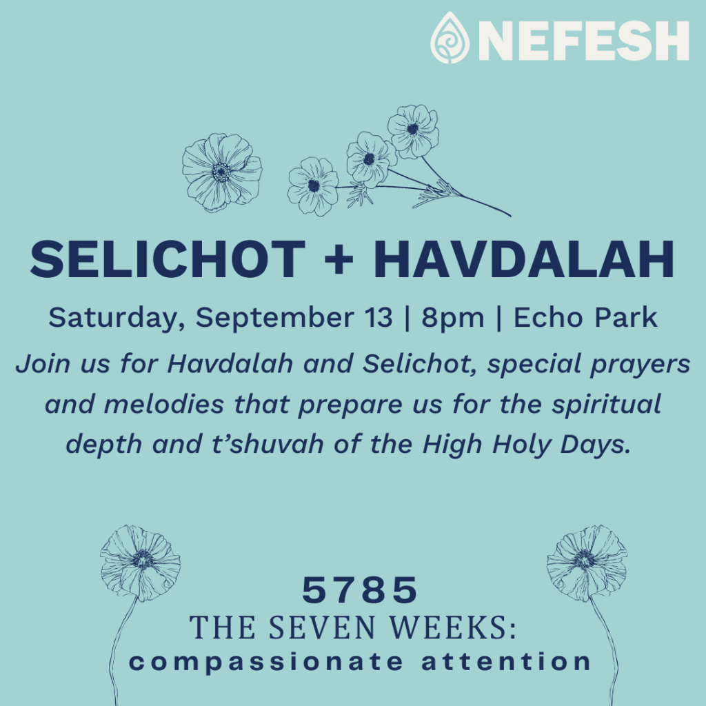 Nefesh will have our special Selichot & Havdalah gathering on Saturday night, September 13th, at 7:30pm in Echo Park and on Zoom. We will share Selichot prayers and melodies from the Middle East and North Africa and Europe. Selichot prayers are special prayers that prepare us for the spiritual depth and t’shuvah of the High Holy Days. We look forward to entering into the sacred place of Selichot together.