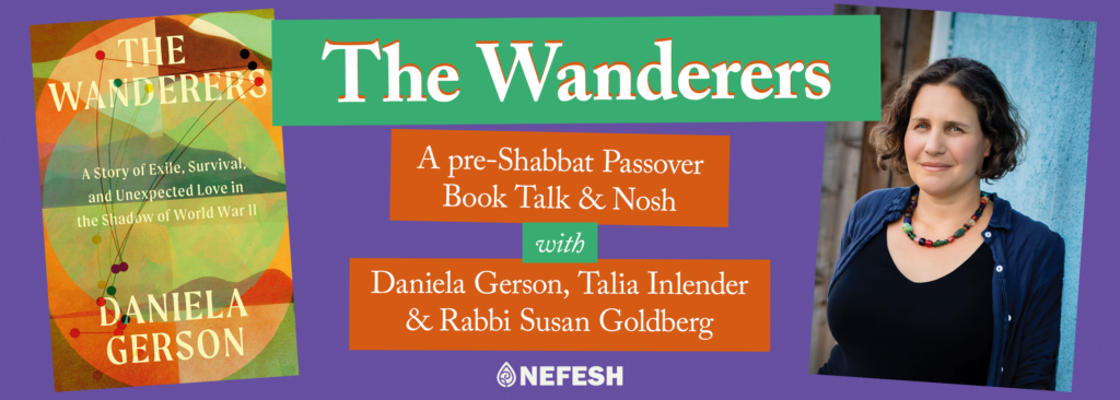 Before Shabbat of Passover on April 3, join us for a special pre-Shabbat Book Talk & Nosh with writer and Nefesh Kin and Board Member Daniela Gerson. She will read a passage from her new book “The Wanderers,” followed by a discussion with Daniela, Talia Inlender, and Rabbi Susan about the themes of the book and its connections to Pesach. We’ll then enjoy some delicious matzo ball soup, matzo with herring, and vodka (while supplies last!), and head downstairs for Shabbat services.