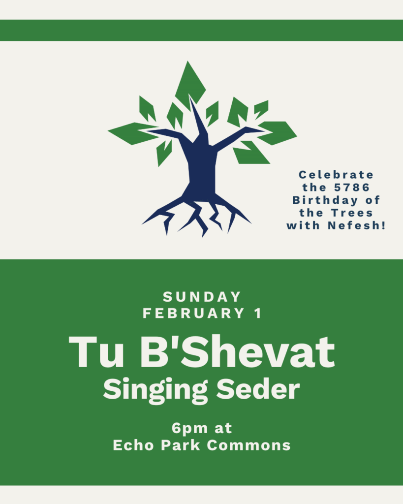 We warmly welcome you to join our Nefesh Tu B’Shevat Seder on Sunday, February 1st at 6pm in Echo Park. This will be a special, earth-based and creative ritual celebration of the Birthday of The Trees. This year, our Tu B’Shevat Seder will be interwoven with joyful music and communal singing led by Duvid & Sally. Our symbolic seder will nourish your soul with fruits and nuts like figs, grapes, dates, olives, wheat, and barley, celebrating nature and our connection to the land. And, we will have soup and fresh bread to nourish our bodies!